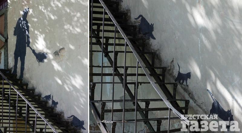 Есть и работы, не посвященные известным персонам. Например, на улице Комсомольской можно увидеть граффити в защиту бездомных животных от художника Ура. Еще одна его работа располагается на улице Ленина: там дворник выгоняет с лестницы кошек.