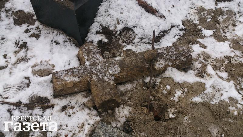На углу улиц Карла Маркса и Гоголя в Бресте длительное время находился пустырь. Сейчас ООО «Научпром» роет там котлован под строительство дома. Из-за шквалистого ветра одно звено металлического ограждения, опоясывающего стройплощадку, упало, и 16 марта горожане смогли увидеть, что у края котлована лежат надгробия и кресты. Все это было извлечено ковшом экскаватора из недр земли.