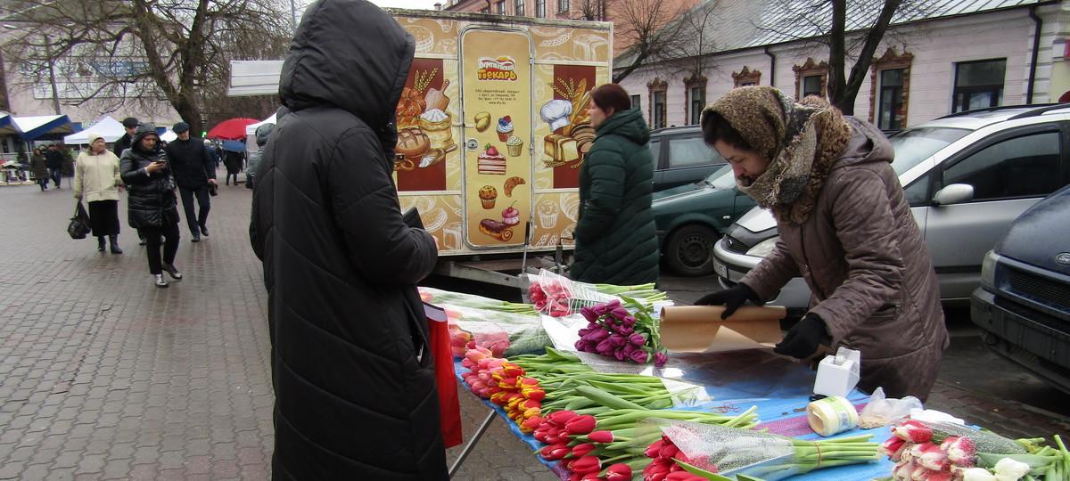 Торговцы цветами возле Брестского рынка продают в основном тюльпаны. Пока не видно ни мимоз, ни хризантем.