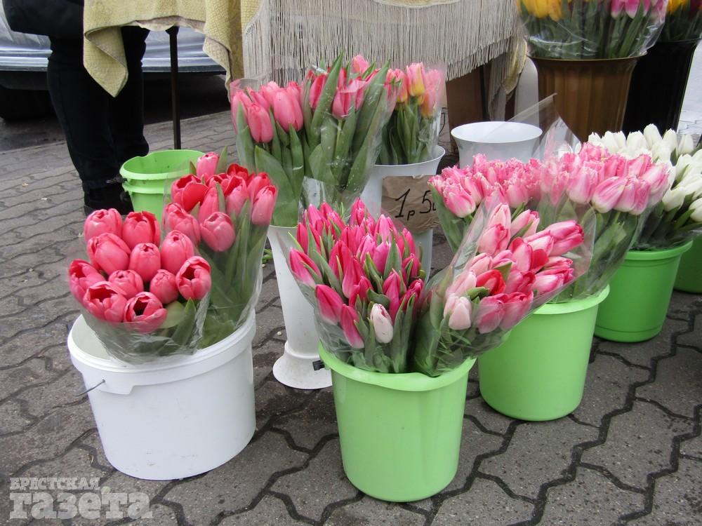 В большинстве точек с цветами возле Брестского рынка продают только тюльпаны. Пока не видно ни мимоз, ни хризантем.