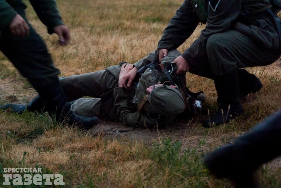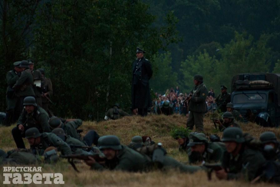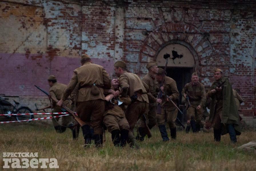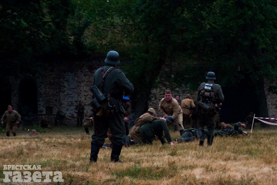 Началось действо с показа мирной жизни гарнизона и того, как войска НКВД отлавливали диверсантов. Эта картина сменилась внезапным артналетом фашистов. Одним из первых в бой с немецкой штурмовой группой вступил личный состав третьего батальона 84-го стрелкового полка под руководством Самвела Матевосяна. Его роль исполнил Олег Калашников из Воронежа.