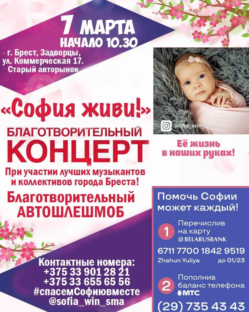 В концерте, который начнется в 10.30, примут участие известные брестские исполнители. Автомобили же выстроятся в призыв: «София, живи!». На утро 5 марта для флешмоба не хватало 18 машин. Организаторы просят присоединиться неравнодушных. Акция займет около часа, но очень поможет в сборе средств на лечение малышки. Флешмоб снимут на видео, а смонтированный ролик опубликуют в соцсетях.