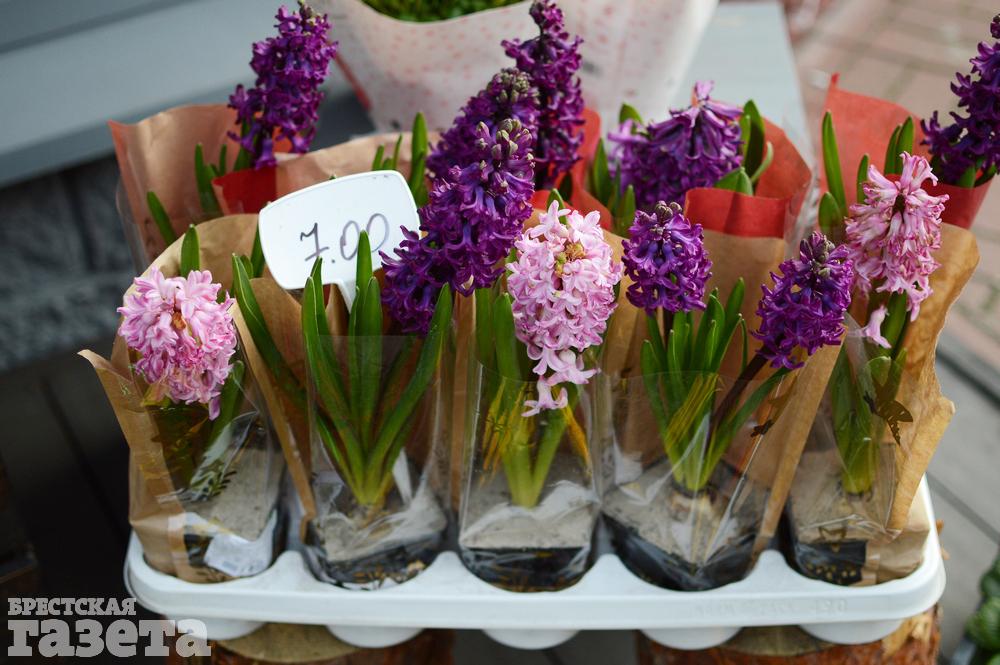 Кроме тюльпанов, на улице и в павильонах возле «Брестского рынка» в четверг продавали розы (от 4 до 7 рублей за штуку), гвоздики (по 4 рубля), ирисы (по 3 рубля). Можно купить и цветы в горшочках: крокусы стоят около 4 рублей, нарциссы от 7 до 12, тюльпаны около 5 рублей, гиацинты — по 7, примула — 5, кустовые розы — 18, хризантемы — около 7, цветущие каланхоэ — тоже 7, орхидея — около 25 рублей. А вот мимозы в этот день корреспондент «БГ» не нашла.