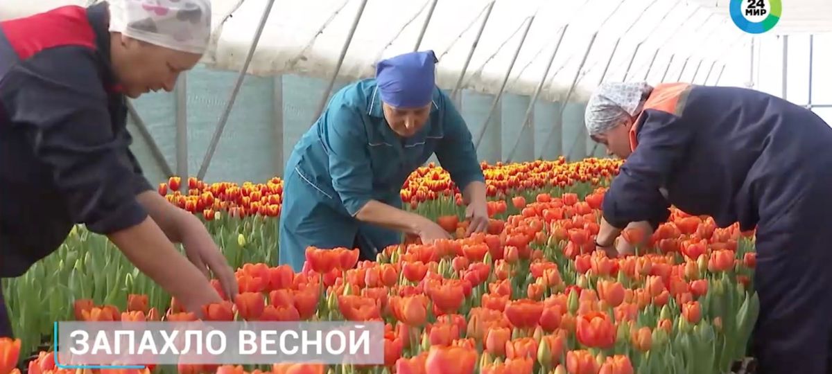 Основную партию тюльпанов реализуют к 8 Марта. Хранят их при температуре 2–3°С в холодильниках, где они сохраняют свежесть до отправки.