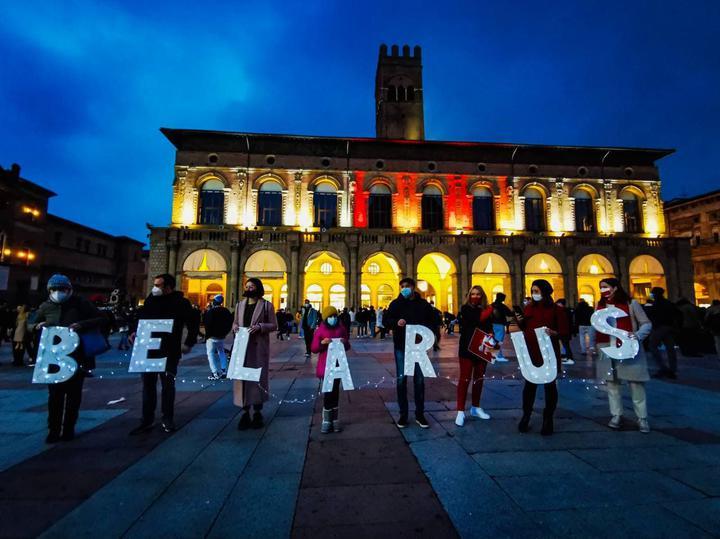 В Италии (Болонья) старинное здание на главной площади Болоньи подсветили БЧБ-цветами.