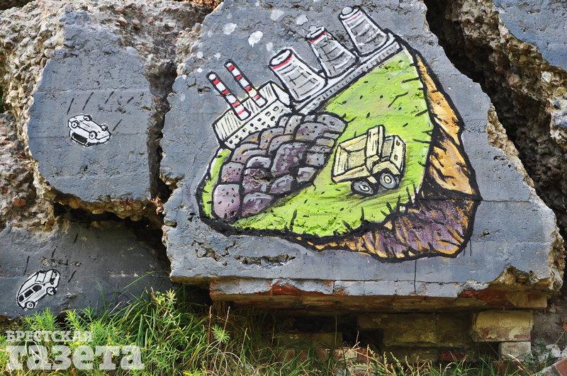 Уличный художник Предок разрисовал новый объект на Форте IV. На основной части изображена деревня с зелеными полями и полноводной рекой. От нее «отколота» атомная станция.