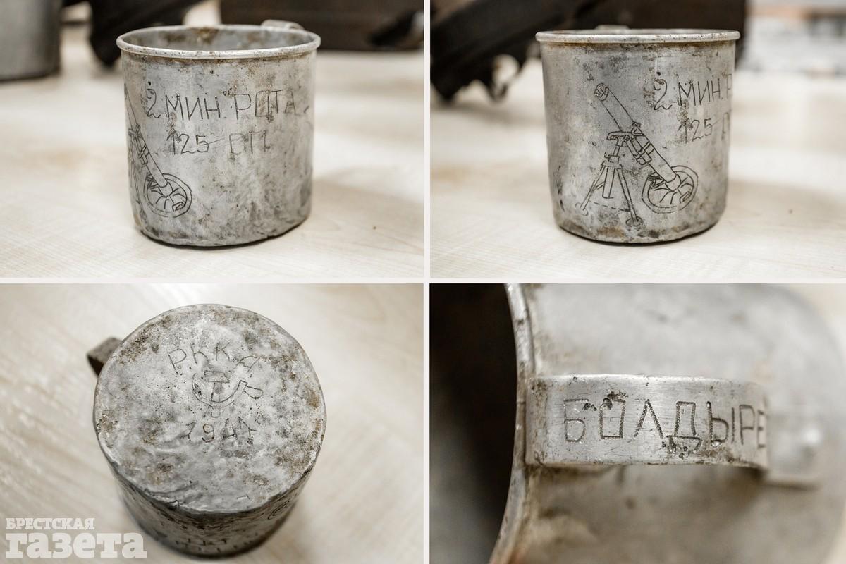 Походная кружка предвоенного времени с оригинальными рисунками и надписями в экспозиции музейной комнаты пограничной заставы им. А. М. Кижеватова появилась не очень давно. На боковой части острым предметом нанесено изображение штатного 120 мм миномета образца 1938 года. На донышке расположены серп и молот, символ олицетворяющий единство рабочих и крестьян, аббревиатура РККА, 1941 год.