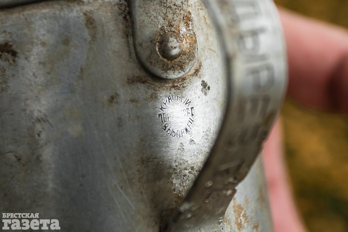 Судя по клейму, такие походные кружки производились на заводе «Красный Выборжец» в Ленинграде с 1925 по 1928 годы и выдавались каждому бойцу. Долгое время личный солдатский предмет лежал в музейном фонде заставы. Нам удалось установить, что ее нашли пограничники во время парко-хозяйственных работ на берегу Буга.