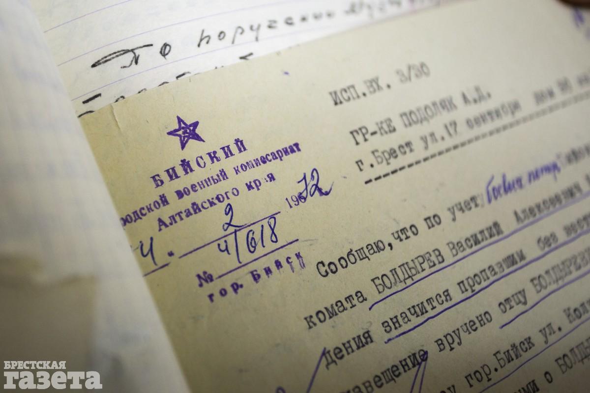 Елена Владимировна ведет исследовательскую работу по военнослужащим предвоенного гарнизона. Можно с уверенностью сказать, нам очень повезло. Оказалось, что судьбой Бодлырева еще в 1972 году интересовался Алексей Данилович Подоляк, бывший заместитель командира партизанского отряда им. Котовского по разведке Брестского соединения. Алексей Данилович 50 лет назад проделал большую работу. Вел переписку с военкоматом города, откуда Болдырев был призван, и даже вышел на его родного брата.