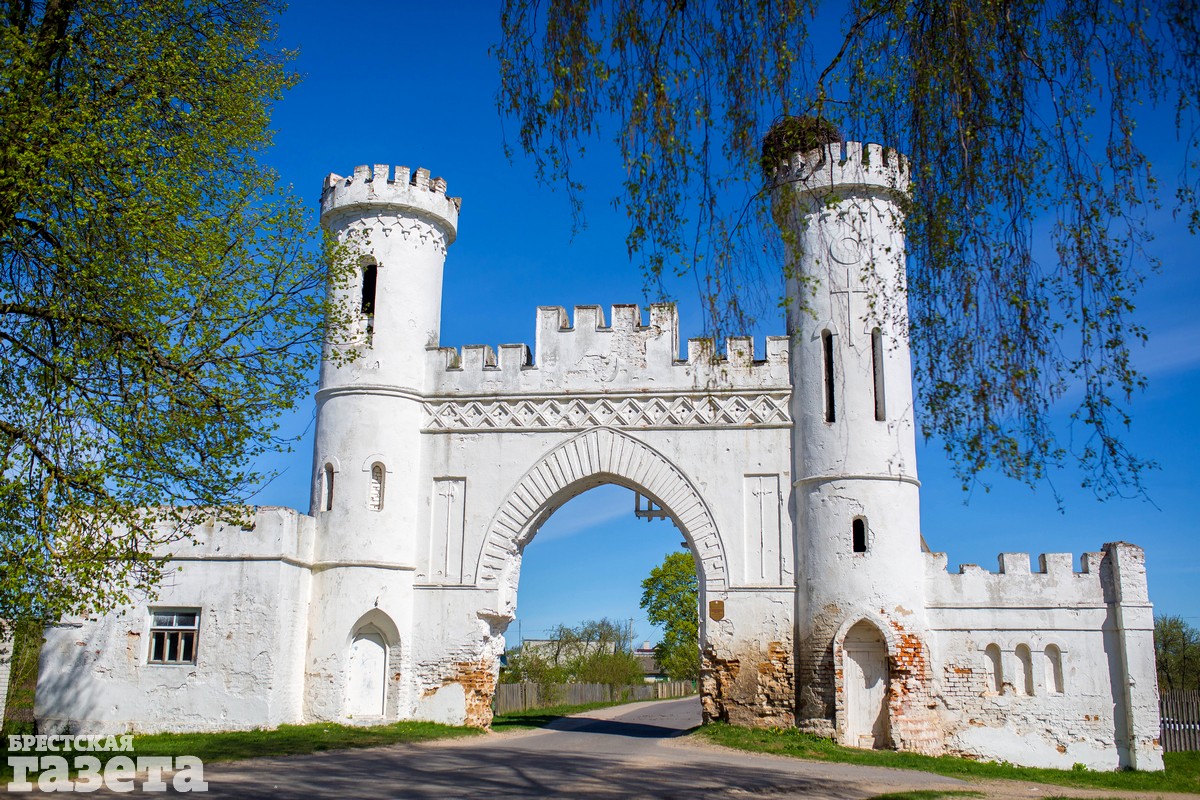 Красивым финалом нашего маршрута стала белоснежная брама в деревне Старые Пески. Этот архитектурный памятник остался от шикарной усадьбы Пусловских, которая до наших дней не сохранилась. Брама решена в виде средневековых крепостных ворот с двумя увенчанными зубцами многоярусными башнями. На ее фоне получаются незабываемые селфи.